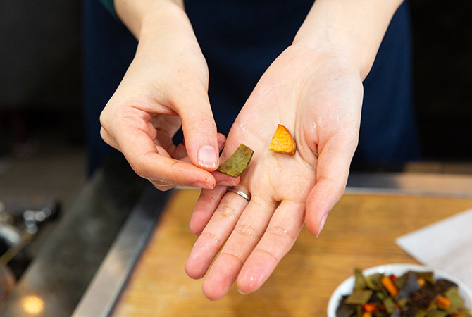 アボカドの下処理を行います。実の部分が残っていると色づきが悪くなるので、できるだけ取り除いておきましょう。アボカドの皮と種は可能な範囲で細かく刻んでおくのもポイント。こうすることで、色が出やすくなります。