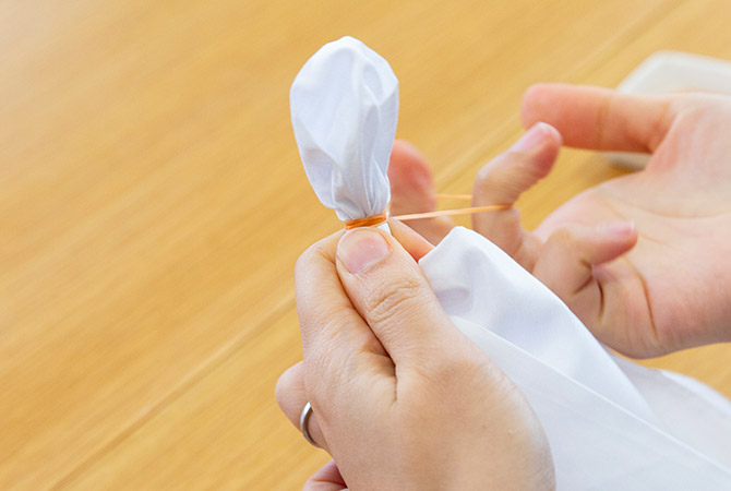 続いて、ハンカチの重さを量ります。新品のハンカチには糊がついていたり、使用済みのハンカチだと汚れがついていることがあるので、洗濯して糊や汚れを落としてから使います。輪ゴムで縛った部分は染まりにくく、白い円状に残るので、ハンカチのお好みの位置を輪ゴムで縛りましょう。輪ゴムから飛び出す布の範囲が大きいほど大きな円ができます。輪ゴムは固めに縛るのがおすすめです。はっきりとした白い模様を作れます。