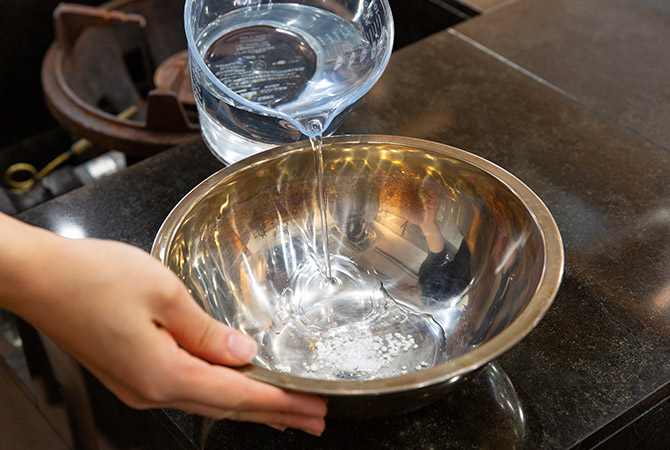 焼きミョウバンを水750mlに溶かしておきましょう。ミョウバンの液は「媒染液」と呼ばれ、ミョウバンの中に含まれるアルミニウムには染料と繊維を結びつける働きがあります。ミョウバンに限らず、金属を含んでいれば媒染に用いることができます。アルミを使うと鮮やかに、鉄だと暗めの落ち着いた色合いになるのが特徴です。