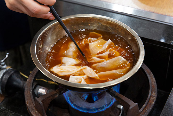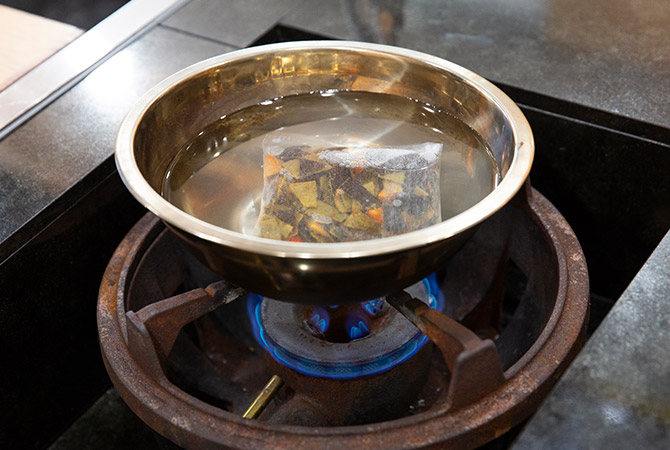 続いて染色液を作ります。鍋またはステンレス製のボウルに水を約750ml(布の重さの50倍)入れ、刻んだアボカドの皮と種をお茶・だし用パックに入れて火にかけ、沸騰させます。液量が減ってきたらその都度お湯を足しながら30分煮だし、パックを取り出します。この時点でお湯が減っていたら再び750ml程度になるまで足しましょう。