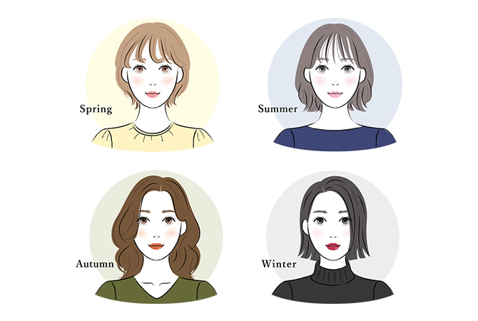 パーソナルカラー診断とは、肌や髪、目の色などの特徴に基づいて、その人に似合う色を判定することです。人間は、複数の色を見ると必ず目の錯覚を起こします。服の色によって顔色がよく見えたり悪く見えたりするのはそのためです。個人の特徴を4シーズンと呼ばれる「春・夏・秋・冬」の4タイプに分類したものが、パーソナルカラーになります。