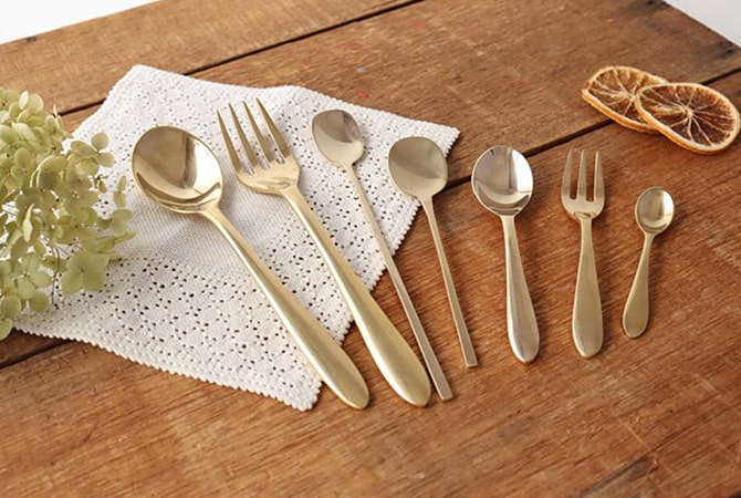真鍮とは、銅と亜鉛を混ぜ合わせた合金のこと。食卓に上品な華やぎが生まれる、主張しすぎない金色が特徴的です。一方、銀食器は、美しさや滑らかな質感に加え、熱伝導率の高さが魅力。料理の温度感がそのまま伝わります。どちらもお手入れは欠かせませんが、大切に使いながら経年変化を見守ることも楽しみのうちです。