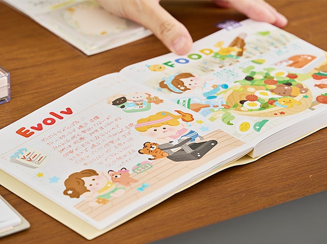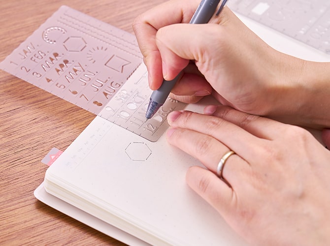 ページを自由にデザインすることで「自分らしさ」を出せるのも手帳の魅力です。イラストやアイコンを楽に描けるテンプレートがたくさん発売されていますので、絵心に自信がない方には気軽に手にして、文字を書くだけでない手帳の楽しさを体験してください。シールや写真で手帳の紙面をデコレーションするのもオススメです。ハンコや付箋は、ページをカラフルに彩るだけでなく、言葉で記すのが億劫なときでもスペースを埋められて便利です。