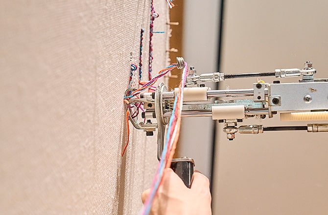 糸をセットしたらタフティングガンで布に打ち付けていきます。派手な音が鳴りますが慌てず、道具をしっかりと押さえつけながらガンを走らせます。布にミシンを走らせるのに似ていますが、ミシンとの違いは失敗しても大丈夫なこと。糸を引き抜けば、やり直しがききます。タフティングガンの重さは1キロ前後ですので、女性でも手軽に扱えると思います。