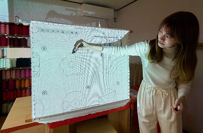 木枠に張った生地に、あらかじめ描いておいたイラストを投影し絵柄を油性ペンなどで書き写します。