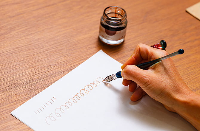 実際にガラスペンを使ってみましょう。ペン先の1センチ程度をインクに浸せばしっかりと吸い上げてくれます。深く浸すとペンと瓶がぶつかって割れる危険性もあるので要注意です。ペンは斜めにしっかりと握り、紙の上を滑らせるように書きます。書く上でガラスペンの魅力は、線が太くも細くもならない単一の「モノライン」であること。普段使いの鉛筆やボールペンより若干スピードを上げて書くと、同じ太さの線がスラスラ書ける楽しさを実感できるでしょう。線の太さが変わらず、ゆっくりだと濃く、速いと薄く書けるのもガラスペン独自の書き味です。慣れると緩急の使い分けもできて、書くことがもっと面白くなります。使い終わった後は水でゆすいで拭くだけ。万年筆のようにインクが詰まったりしないのでメンテナンスはとても楽です。