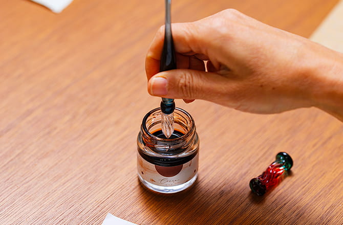 初めてガラスペンを購入するにあたっては、「見た目の好み」で選んでOKです。試し書きのできる販売店もありますので、まずは使ってその書き心地を確かめてください。ペン先とインクの相性によっても書き味は変わります。「インク沼」という言葉もあるくらい奥深い世界のため、どんなインクを選べば良いか決めかねるかもしれません。その場合、ガラスペンとインクがセットになった商品を購入してもいいと思います。数千円のものからあるので、気軽にはじめることができます。なお、インクは紙に滲むことがあるので、試し書きをしながら紙を選ぶと良いでしょう。