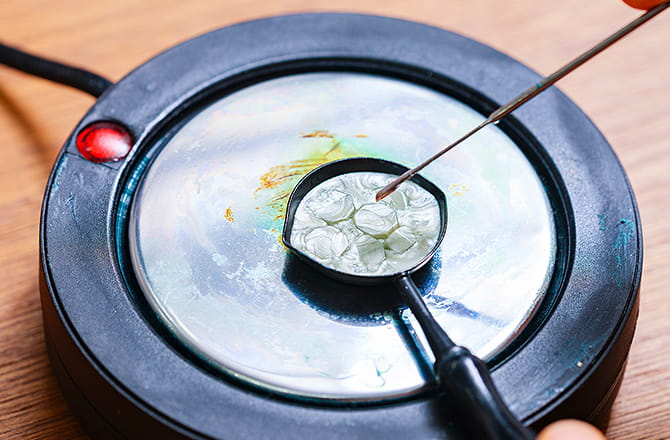 シーリングスタンプを使うには、固形のシーリングワックスを溶かすための熱源と専用のスプーンが必要です。熱源は、キャンドルの炉で本格的な雰囲気を味わうのも手ですが、より安全に使える専用のホットプレートなども販売されています。道具が揃ったら、スプーンの中のワックスを温め、液状になったら下に垂らします。一気に垂らすとワックスが広がってしまうので、なるべく少量ずつ垂らしましょう。何度か試すうちに、ちょうどよく広がるワックスの状態がわかるようになります。スタンプは、垂らしたワックスが固まる前に押します。押した後、10~30秒ほどは固まるのを待ちます。その後、ゆっくりスタンプを外せばシーリングスタンプの完成です。直接紙にワックスを垂らすのが伝統的なやり方ですが、一度垂らすと剥がすことができず、やり直しがききません。そのため、シリコンマットの上でスタンプしたワックスを剥がして、好きな場所に両面テープを使って貼ってもいいでしょう。慣れるまではこの方法がおすすめです。