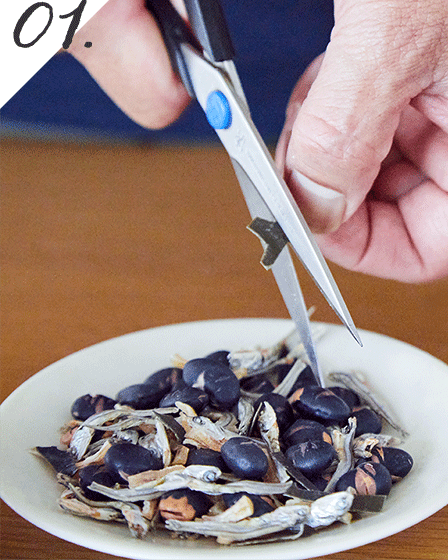 - 炒った黒豆にサイズを合わせてカットした干し貝柱と昆布とジャコを「合わせただけ」の乾き物ミックスおつまみ。キッチンバサミよりも文具向けのはさみのほうが細かい作業もできる上、切れ味もいい。もちろん消毒して使う。