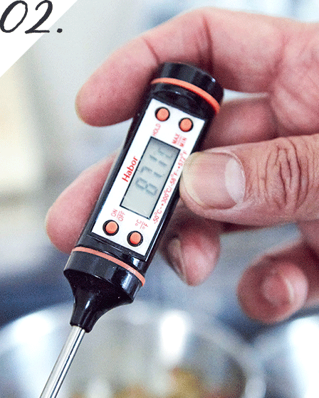 - 「飲食店で一番困るのは生焼け」。加熱するレシピを開発しているときは、必ず仕上がりの温度も計測する。「85℃あれば、だいたい大丈夫」だそう。