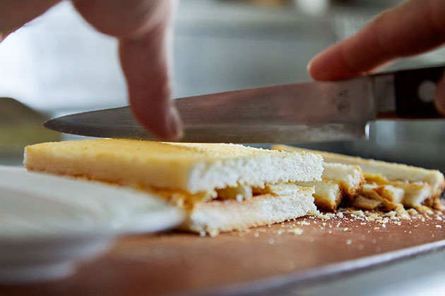 看板のサンドイッチには無限のバリエーションがあるが、間口さんのカットは三角や4つ割ではない。縦に4等分に細長く切る。この台所から生まれるのは、あくまでバーのつまみ。片手でつまんで大きな口を開けずとも楽しめる。そういう味のアイデアを生むのが、この簡素な台所なのだ。
