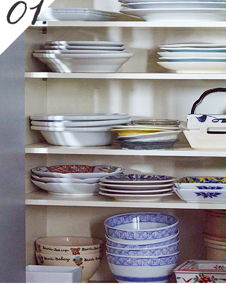 - 「奥行きを深くしても、奥のほうの皿は取り出さなくなっちゃうから」と食器棚の奥行きは大皿1枚分。普段使いは浅い皿が多いので各段の高さは低く、その分棚板の数を多くしつらえてある。