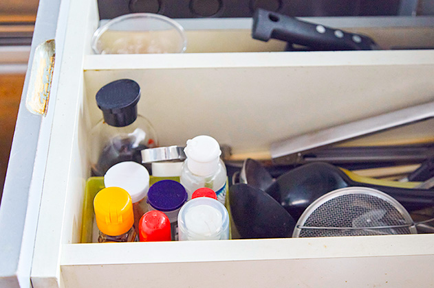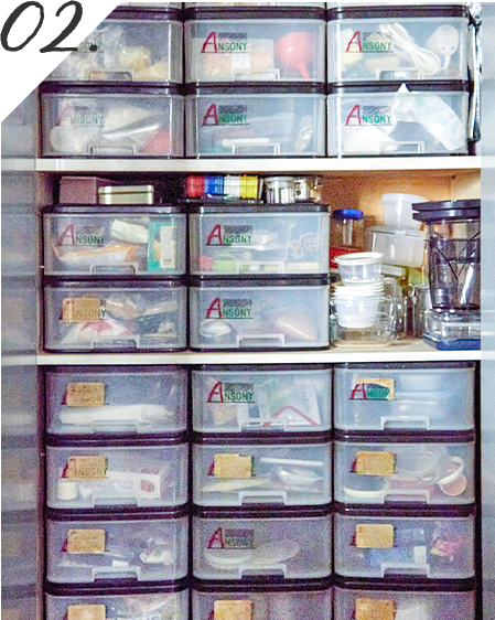 - 「通販のカタログを穴が空くほど調べて(笑)」購入した棚にピタリとおさまる引き出し。どこに何が入っているかは脇さんのみぞ知る。インスタントラーメンが入っている引き出しもあるが「それは夫専用引き出しです(笑)」。