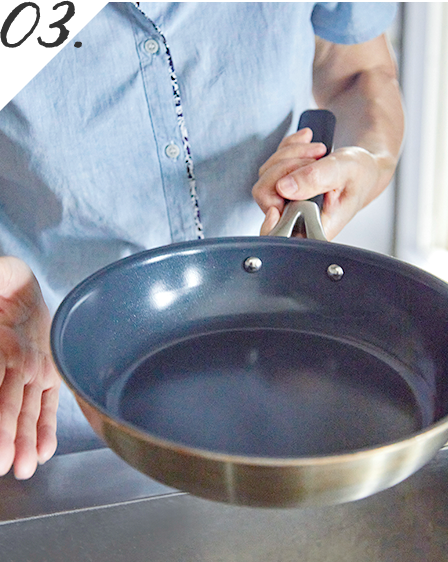 - メーカーと共同開発して作ったIHに最適なフライパン。IHの熱伝導に最適な鋼材を使い、卵2つからでもオムレツが作れる構造に。IHは周辺に余計な熱が逃げないので取っ手も短く収納もしやすい。