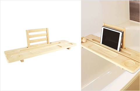 お風呂の縁にかけるだけで、お風呂で本が読める・タブレット操作できる・飲み物食べ物がおける、アイデア次第でリラックスバスタイムが楽しめるバステーブルです。