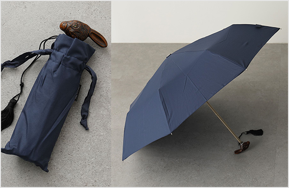 ひょこっと顔をのぞかせる、昔の絵本の挿絵のような木彫り風のウサギが持ち手になった、フランスの老舗傘ブランドの晴雨兼用折り畳み傘。一点一点丁寧に手作りされています。