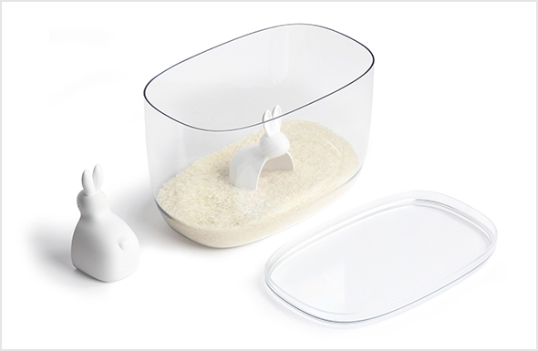 透明な米びつと、日本や世界中で幸運を運ぶモチーフとして親しまれているうさぎの計量カップがセットになっているライスコンテナです。お米以外にも、小麦粉などの粉物を入れたり、おやつストッカーにも便利です。