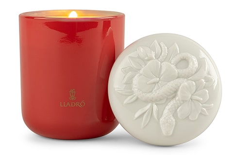 毎年発表されるリヤドロの干支コレクション。十二支の蛇のモチーフが、白く輝く陶磁器の蓋に丁寧に手で彫られています。容器はクリスタルで、キャンドルのアロマは「東洋の秘密」。エキゾチックな沈香を含み、パチョリのノートがあるスパイシーな香りです。