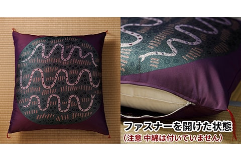 主に仏間で使われてきた金襴(きんらん)の魅力をもっとたくさんの人に知ってほしいという想いから生まれた座布団カバー。日本の伝統的な『干支』を現代的な模様に置き換えて、新しく、自宅でも使いやすく、日々の生活が明るく楽しくなるように、願いを込めて作りました。うねうねと野原をいく3匹のへびはまるで踊っているよう。長いからだで良い縁を結ぶ、縁起の良い生き物です。経糸で使用している紫の色糸をメインカラーに、緑と茶を組み合わせてポップなイメージにしました。
