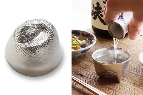 再生と金運アップの象徴「巳(へび)」をデザインした錫のぐい呑み。ひっくり返すと、リアルでいてどこか可愛らしい蛇が現れます。