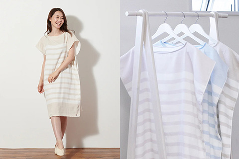 忙しいお風呂上がりに頭からスポッとかぶるだけで着用できる、今治タオルの生地で作ったタオルワンピース。「お風呂上がりにすぐスキンケアをしたい」「子どもと一緒にお風呂に入ると自分のことは後回しになってしまう」などのお風呂上がりの様々な悩みを解決し、快適に過ごせるアイテムです。