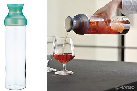 ボトルに茶葉と水を入れるだけ、カラフェ型の水出し茶ボトル。注ぎ口とメッシュフィルターはシリコーンゴム製の一体型で、また、パーツ全て食器洗い乾燥機OKのためお手入れが簡単です。