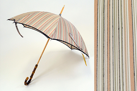 小ぶりなサイズの50㎝と竹の手元を合わせた、軽い晴雨兼用傘。ポリエステルの糸で節を表現しながら紬織風の縞模様を織り上げています。さわやかな甲州織の生地と職人がつくり上げる美しい傘の張りの組み合わせも魅力で、ファッションアイテムにもぴったりです。