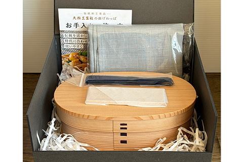 木の美しさと和の温もりが心豊かに伝わる曲げわっぱのお弁当箱と、ハンカチ、ランチベルト、仕切りがセットになった商品です。「お手入れと使い方」のリーフレットの栞付き。ウレタン塗装をしているのでから揚げはもちろん、チャーハンやナポリタンなど、何にでもお使いいただけます。ご使用後は、食器用洗剤でしっかり洗えます。
