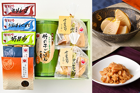 京都産竹の子ご飯の素と春筍・佃煮・茶漬の選りすぐりの詰合せです。簡単便利におうちで竹の子ごはんが食べられるごはんの素・ゆずやかつおで上品な味わいに仕上げた自慢の一品、春筍・国産原料と一緒にまろやかに炊き上げた佃煮がセットになっています。