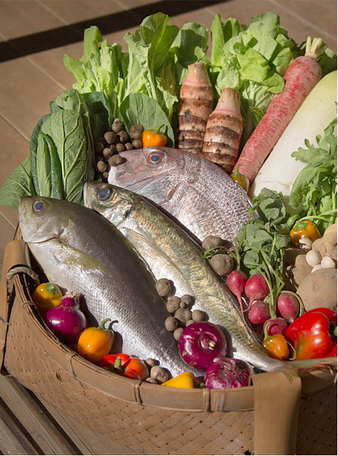 - 日本列島は南北に長く、海、山、里に囲まれているので、さまざまな野菜や魚が豊富に手に入ります。そうした自然の恵に支えられ、多彩な食材で作られてきたのが和食なのです。