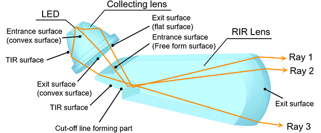 ※3RIR光学系:入射屈折面(Refraction surface)と全反射面(Total Internal Reflection Surface)、及び出射屈折面(Refraction surface)を有する当社独自のヘッドライト光学系
