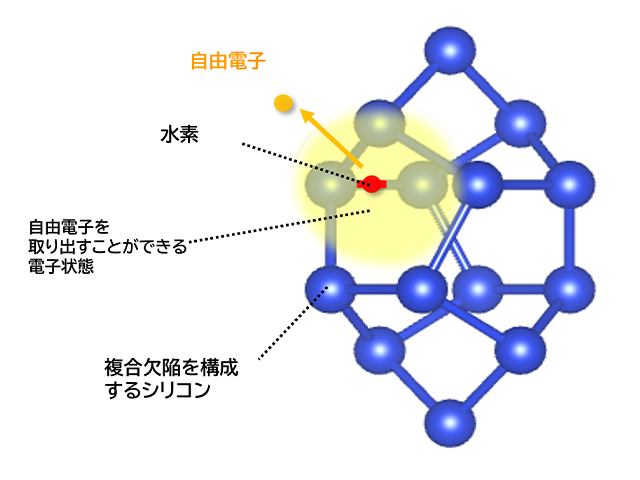シリコン半導体に注入した水素が特定の欠陥※1と結合する過程で自由電子を取り出せる電子状態が形成されることや、水素の持つ電子がこの状態を介して自由電子※2となるメカニズムを世界で初めて※3解明しました。