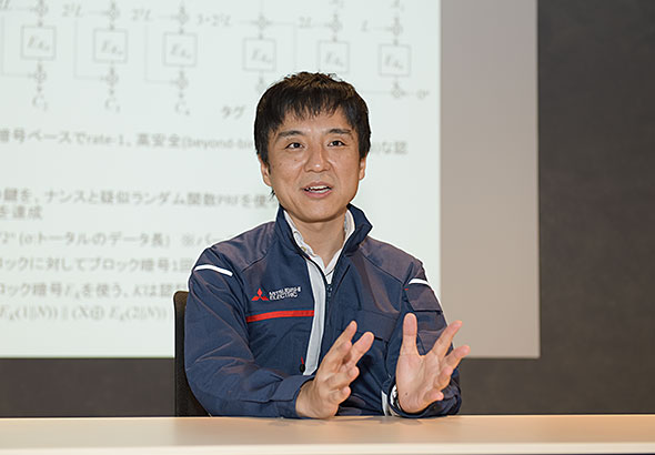 いま共通鍵暗号の分野ではIoTに対応する認証暗号アルゴリズムなどの研究開発に世界中がしのぎを削っています。当研究所でも全力で取り組んでおり、論文作成やアルゴリズム設計など、アカデミックな分野は私が中心となって進めています。暗号の設計指標には安全性、高速性、小型化、利便性などがあります。どの指標に重きを置くかは、実装する機器の種類などによって決まってきます。それぞれの指標についてトップを目指して設計を行っていますが、IoTデバイスへの適用などを考慮し、当社では特に小型化に注力しています。