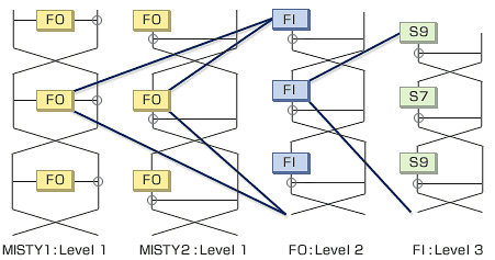 DES型暗号の構造で適用されていたF関数(段関数)の位置を変更しました。これにより、差分解読法及び線形解読法に対する暗号強度を増加させ、段関数の並列計算を可能としています。