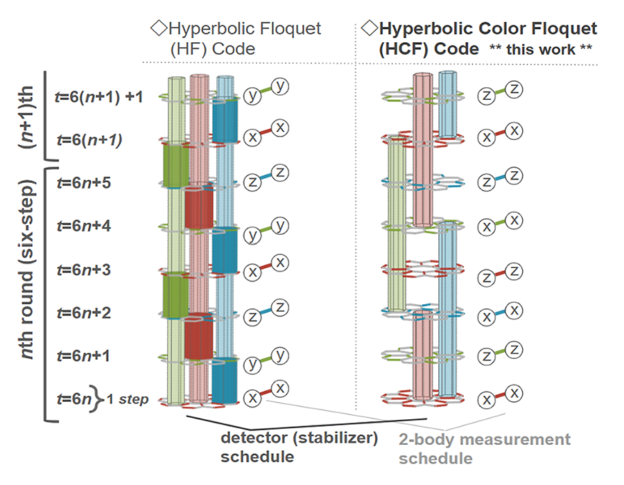 近年、注目を集めている動的符号(従来文献[3])において、有限の符号化率を保ちつつ簡易なパリティ検査で実装でき、従来の動的符号(従来文献[4])よりも軽量なデコーダで効果的に復号可能な HCF(Hyperbolic Color Floquet)符号(従来文献[5])を提案。