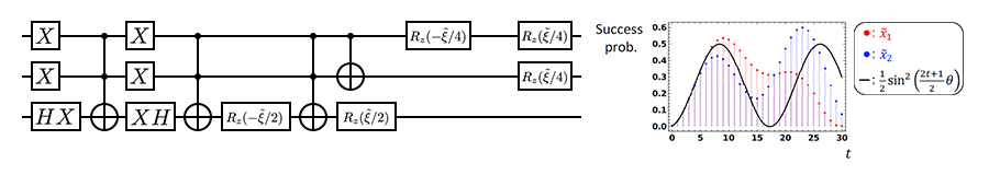 左図は、私達が用いたオラクル演算子の具体例の量子回路図です。ξ̃は優先度の値に応じて変化するパラメータです。右図は所望のデータが2つある場合に、それらを発見出来る確率を数値計算により求めたものです。従来手法であるグローバーのアルゴリズムでは、オラクル演算子の使用回数tを変化させても、常に発見確率が一致しています(黒線)。一方、我々の量子アルゴリズムでは適切なtを選ぶことで、優先度が高いデータ(赤線)が優先度の低いデータ(青線)よりも高い確率で発見されています。