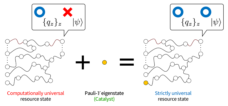 任意の量子回路の出力確率分布の生成は可能だが出力できる量子状態には制限があるリソース状態(計算万能なリソース状態)の中の1量子ビットをパウリY固有状態に置換するだけで、任意の量子状態の生成も可能になります。