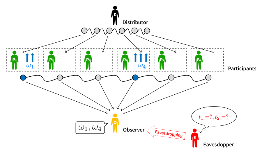 生体磁気のようなプライバシー情報を含むパラメータを測定する場合、パラメータ自体は高精度に推定しつつそれが誰に帰属するのかは秘匿出来ることが望ましいと言えます。そのような匿名性を達成する手法として匿名量子センシングがあります。従来の匿名量子センシングでは初期状態にエラーが発生しないことを仮定しており、エラーが発生した場合は正しいセンシングが出来なくなる可能性がありました。そこで、私達は初期状態にエラーが発生しているかを検証する方法を組み込むことで、初期状態エラーに対してロバストな匿名量子センシングを提案しました(研究開発成果[5])。