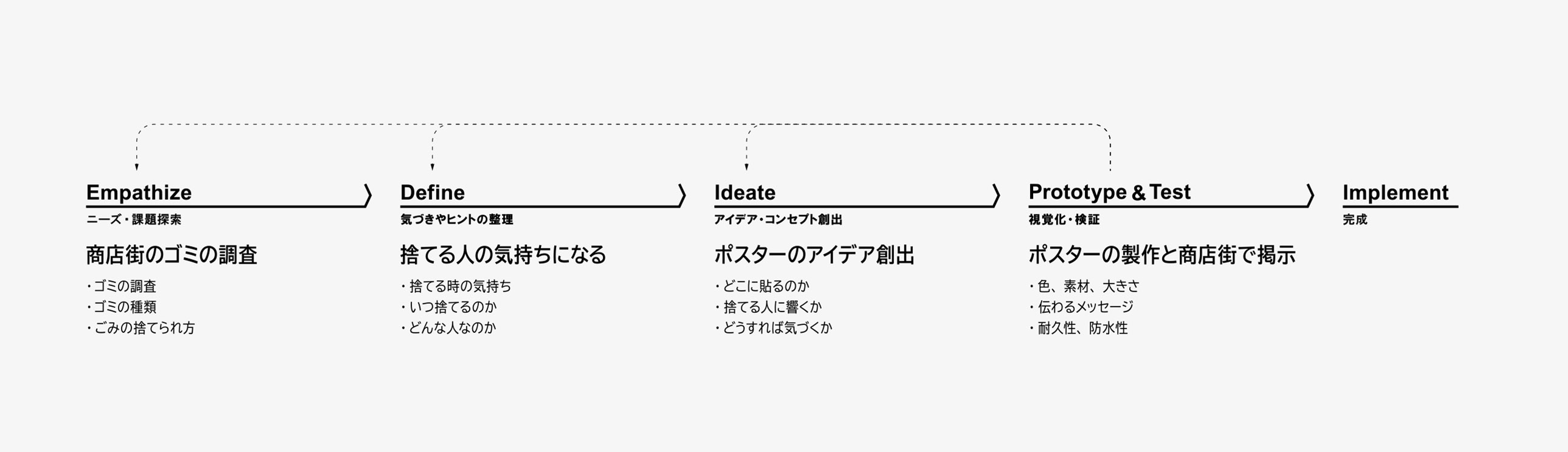 製作したポスターは、商店街に10日間ほど貼り出されました。後日、子どもたちは効果検証のために、商店街のお店の人へのインタビューや現地調査を実施しました。その結果、ポスターを貼る前後でゴミの量にあまり変化がなく、期待通りの効果が上がっていないことを知りました。そこで2回目の授業は、なぜゴミが減らなかったのか、ゴミを捨てている人にメッセージが伝わっているのか、ポスターを貼った場所が正しかったのかなどを、子どもたちと一緒に振り返りました。デザイン思考の重要なポイントの1つとして、「相手の立場になって考えてみよう」に着目し、ゴミを捨てた時の気持ちや、そもそもなぜゴミを捨てるのか、いつゴミを捨てているのか、どこに捨てているのかなど、捨てる人の気持ちを考えながら、2回目のポスターを製作しました。