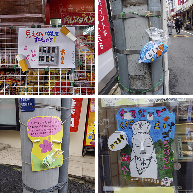 私たち統合デザイン研究所のメンバーと鎌倉市立大船小学校、地域の商店街が連携し、小学生が創造力を発揮しながら、商店街のゴミ問題に取り組みました。商店街の道端に落ちているゴミについて調査し、得られた気づきから解決策のアイデア検討と具体化、さらに実際の商店街での効果検証まで、子どもたちが主体的に取り組むプログラムを立案し、一緒に進めました。最終的には子どもたちの豊かな創造力を発揮した提案が生み出されました。