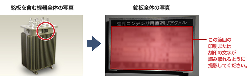 お問い合わせいただく際には、機器情報(「形式」「定格容量」「定格電圧」「製造番号」「製造年」)が必要となります。また、対象となる機器の銘板写真と銘板写真が写った機器の全体写真を添付のうえお問い合わせをお願いいたします。