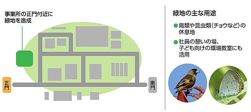 - ■地域在来種を導入するなど、生物多様性に配慮した緑地を造成。従業員の憩いの場や子供向けの環境教育の舞台として活用
