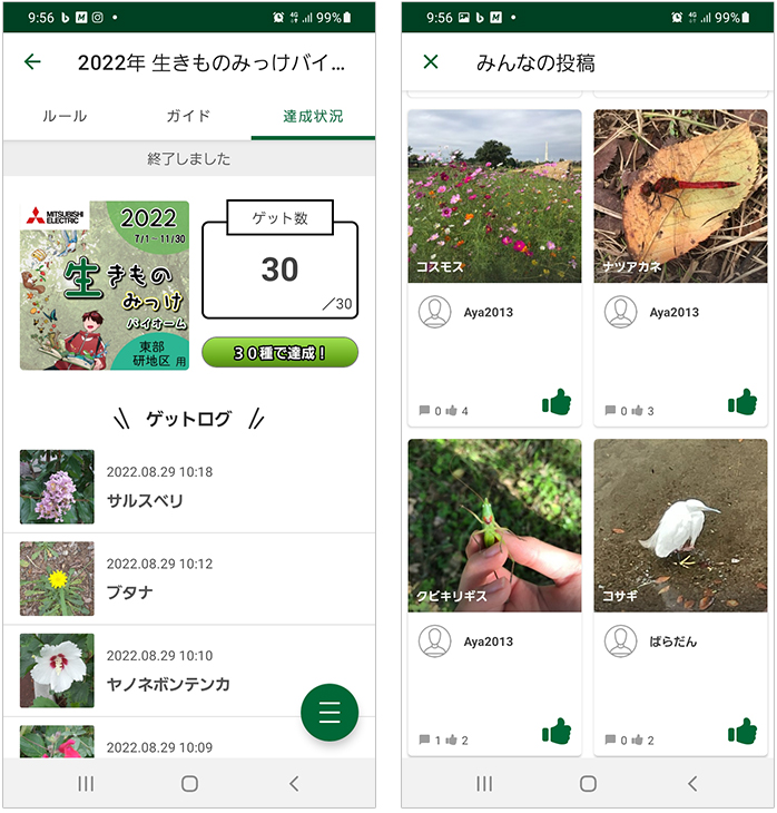 登録された生きものの名前と写真はアプリ画面から閲覧できる