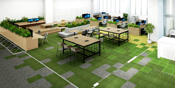 地区内にあるZEB※関連の技術実証棟「SUSTIE(サスティエ)」は、建設時に省エネに関する様々な技術を盛り込んだオフィスビルです。従業員が実際に職場として利用しながら技術の実証を進めるとともに、快適性の検証と向上にも取り組んでいます。壁面緑化や植栽パーティションの設置など、自然とのつながりを考慮したバイオフィリックデザインを取り入れています。