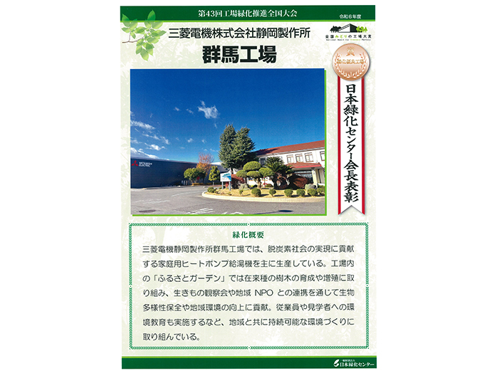 群馬地区は、2024年度にこれに応募し、第43回工場緑化推進全国大会にて「日本緑化センター会長賞」を受賞しました。