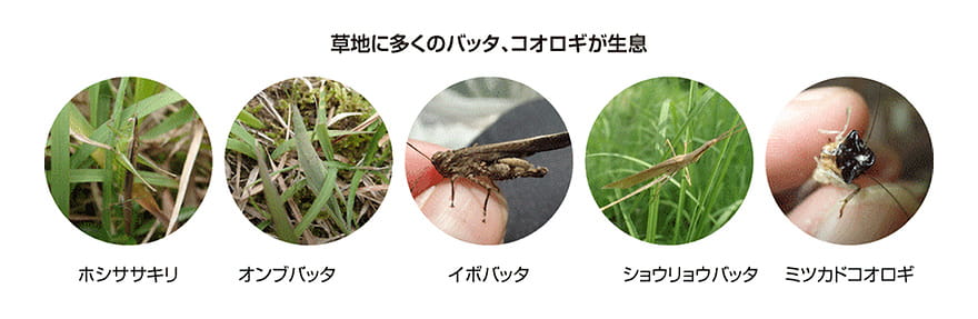 構内の草地では多くの種類のバッタやコオロギが見られ、良好な草地環境があることを示すホシササキリも確認されています。また、エノキを食樹とし、通常は山地に生息するヒオドシチョウなども確認されています。構内にあるエノキは、鳥が構内で糞をし、その糞に含まれていたエノキの種子が発芽・成長したものと考えられます。鳥たちによって外部から種子が持ち込まれたことで、生きものの種類が豊かになっている一例といえます。
