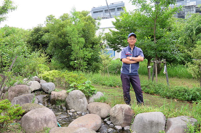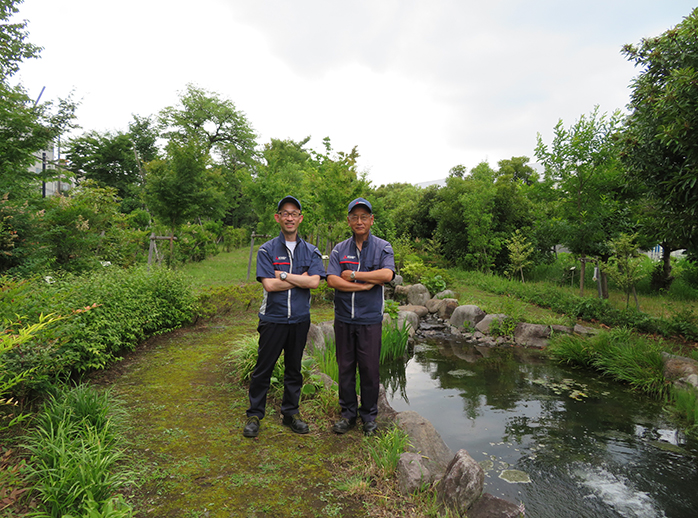 相模地区では担当者が日々のチェックと管理を行っていますが、アオミドロに代表される「藻」の過剰な繁茂への対処が大きな課題の一つとなっています。これまでの対処結果をもとに年間を通した管理の方法を定め、敷地内の緑地管理を行う子会社とも連携しながら取り組んでいます。