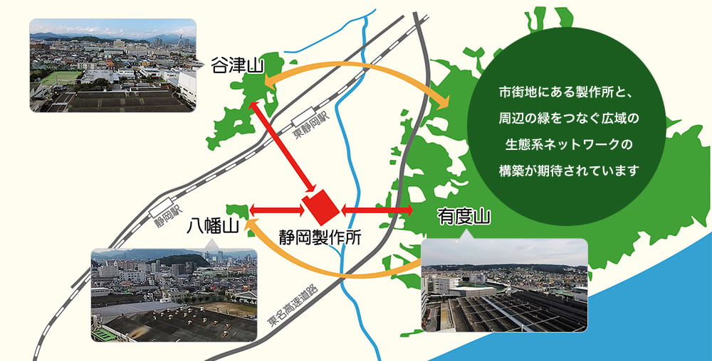静岡製作所の半径1km以内は、近年ではほとんどが工場や宅地となり、緑の多い土地は少なくなっています。しかし、製作所から離れると、東側の「有度山」や西側の「谷津山」「八幡山」のように、緑が多く、鳥類や昆虫類が利用している、自然豊かなエリアが残されています。
