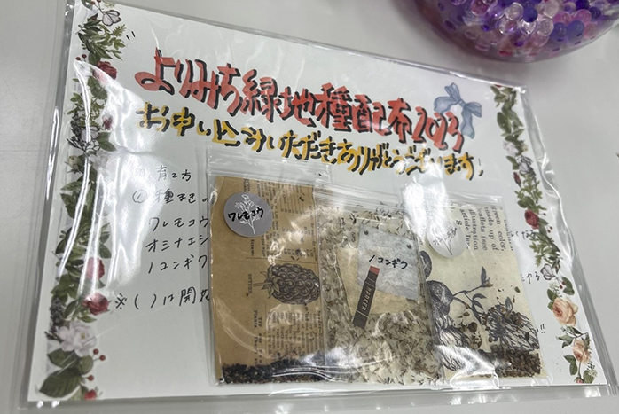 2023年度は前年度に引き続き、「よりみち緑地」で収穫した植物の種を従業員に配布しました。また、5月には、静岡製作所の近隣住民を招いて行うイベント「サンサンフェスタ」でのイートインコーナーでも種を配布し、計80袋を持ち帰ってもらいました。これらの種をご自宅の花壇などに蒔いてもらうことで、よりみち緑地の輪を広げていきたいと考えています。