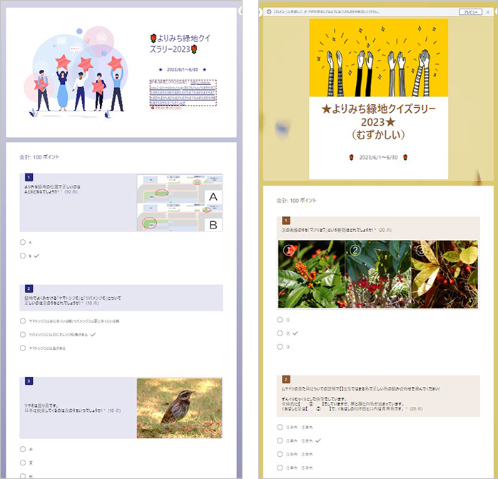 6月には前年度に引き続き3回目のクイズラリーを開催しました。前回開催時にアンケートで寄せられた意見を踏まえて、クイズラリーシートを紙媒体とWebフォームの2種類用意したところ、230名と、前年度(160名)を大きく上回る参加がありました。参加者からは「生き物や植物に興味がわいた」「緑地に行く機会が増えた」「今後もぜひ続けてほしいです」などの声があり、楽しく生きものについて学んでもらっています。